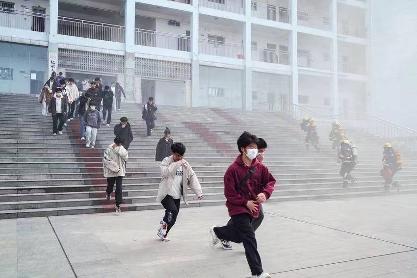 下午3时许,一阵急促的119警报声在校园响起,疏散逃生演练正式拉开帷幕。在老师和市消防救援人员的引导下,学生捂住口鼻,小步快走,有序从安全出口鱼贯而出,5分钟内全部安全撤离至集合点。