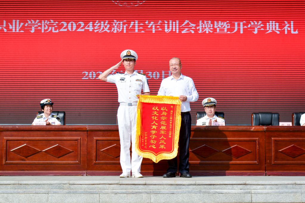 军训会操结束后,党委书记邓念国向海军工程大学赠送 “以身示范展军人风采 以文化人育学子初心”锦旗。