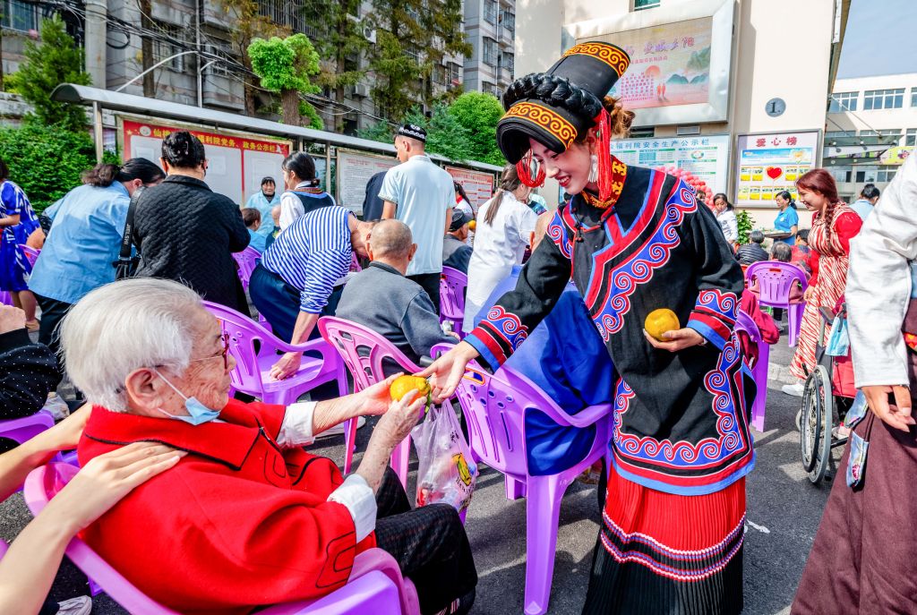 当天上午,伴随着欢快的音乐,学院“籽籽同心”工作室的志愿者身着传统的民族服饰,翩翩起舞,为老人们带来了一场精彩的民族舞蹈表演,博得老人们一阵又一阵的掌声。舞蹈表演结束后,学生志愿者为老人们精心准备了水果、点心等爱心物品,并送到每一位老人的手中。老人们接过礼物表示感谢,脸上洋溢着幸福的笑容。
