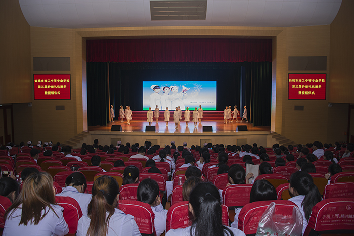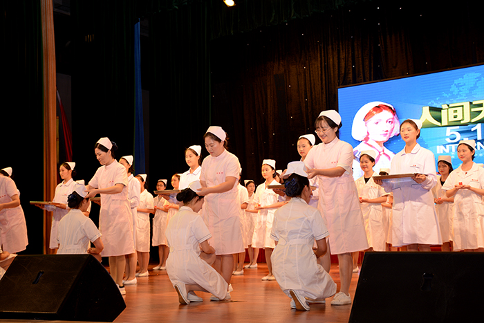 在第106个国际护士节到来之际,5月11日晚,理工中专在文化艺术中心举行第三届护理礼仪展示暨授帽仪式。