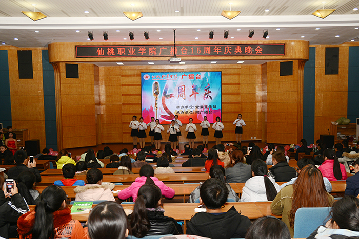 庆典上,广播台成员制作的专题片展示了15年的发展足迹,已毕业的广播台成员送来了对广播台和学院的美好祝愿,精心编排的小品、相声、古筝合奏、手语表演等节目接连上演,诗朗诵《我骄傲,我是广播人》更是赢得了现场观众的阵阵掌声。在大合唱《相亲相爱》中,晚会圆满落下了帷幕。