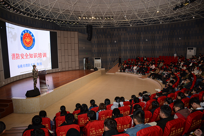 12月12日下午,保卫处在多功能厅举办专题讲座,邀请市消防大队副大队长张明作消防安全知识培训。学生公寓管理员、实验实训室管理员、各班学生安全员等近300人聆听讲座。