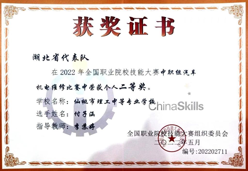 8月8日至8月11日,2022年全国职业院校技能大赛中职组汽车机电维修赛项在山东德州交通职业中等专业学校举行,我院理工中专代表湖北省参加本次比赛,与来自全国各省市区的87支代表队同台竞技。在比赛中,汽车运用与维修专业学生付子涵荣沉着应战、奋力拼搏,荣获二等奖。