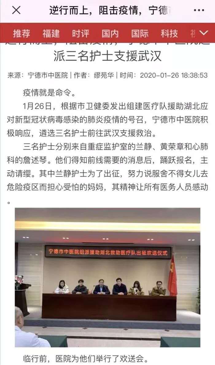 兰静是医学院护理专业2012级学生,毕业后在福建省宁德市中医院工作。宁德市卫健委发出组建医疗队援助湖北应对新型冠状病毒感染的肺炎疫情的号召后,来自重症监护室的兰静踊跃报名、主动请缨,成为了第一批参加福建省支援湖北省的医疗队一员,并被派往武汉市中心医院。
