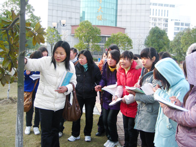 图为经济与管理学院教师许爱华带领观光农业、园艺技术两个专业学生冒着倒春寒实训,为学生讲解树木栽培与养护技术。