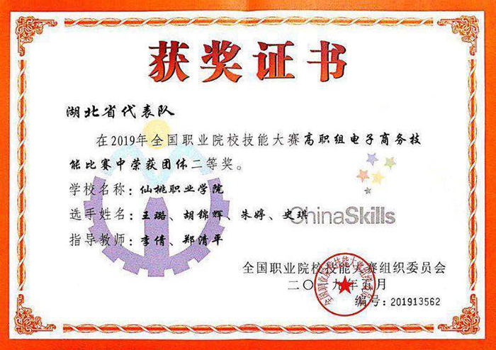 在高职组电子商务技能赛项中,计算机科学技术学院学生王璐、胡锦辉、朱婷、史琪组成的代表队获得团体二等奖。这是继2018年之后我院再次获得此赛项的全国二等奖,也是湖北省高职院校在该赛项中获得的唯一奖项。