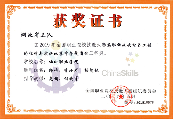 在高职组光伏电子工程的设计与实施赛项中,由机械电子工程学院学生邹浩、李小龙、杨茂林组成的代表队获得团体三等奖。