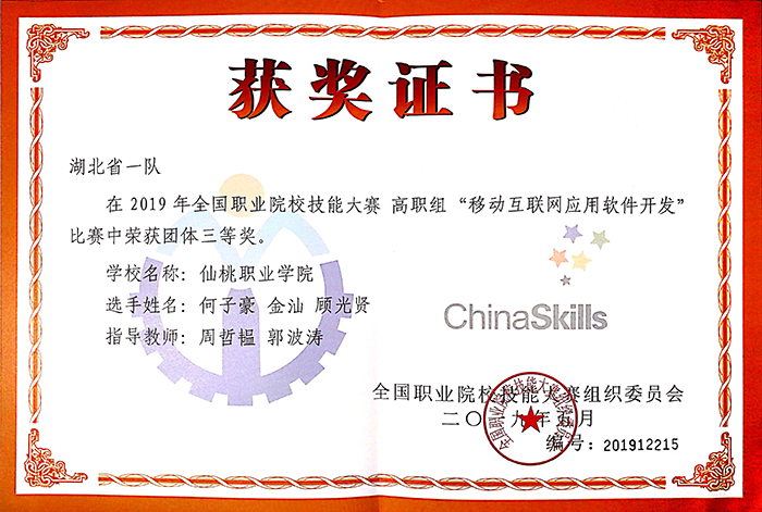 在高职组移动互联网应用软件开发赛项中,由计算机科学技术学院学生何子豪、金汕、顾光贤组成的代表队获得团体三等奖。