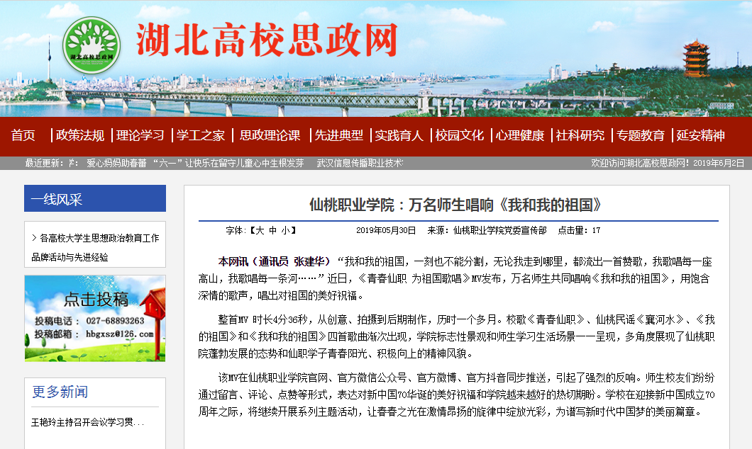 湖北高校思政网2019年6月2日报道 “我和我的祖国,一刻也不能分割,无论我走到哪里,都流出一首赞歌,我歌唱每一座高山,我歌唱每一条河……”近日,《青春仙职为祖国歌唱》MV发布,万名师生共同唱响《我和我的祖国》,用饱含深情的歌声,唱出对祖国的美好祝福。