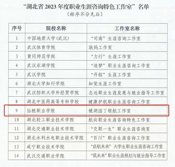 近日,经高校申报、专家评审、实地考察等程序,湖北省高等学校毕业生就业指导服务中心公布2023年高校职业生涯咨询特色工作室名单,教育学院镜湖园丁领航工作室成功入选。