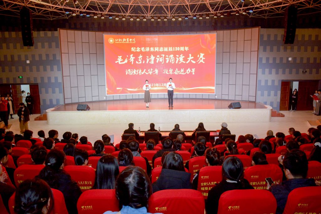敬献花篮仪式后,师生代表一同到多功能厅观看毛泽东诗词诵读大赛。比赛中,选手们或独诵,或男女诵,或团体诵,《七律•长征》《沁园春•雪》《七律•人民解放军占领南京》《清平乐•六盘山》……一首首脍炙人口的诗词穿越历史时空而来,充分展现了一代伟人的雄才大略和豪迈气概,深切表达了莘莘学子对一代伟人的深切缅怀和无限崇敬。