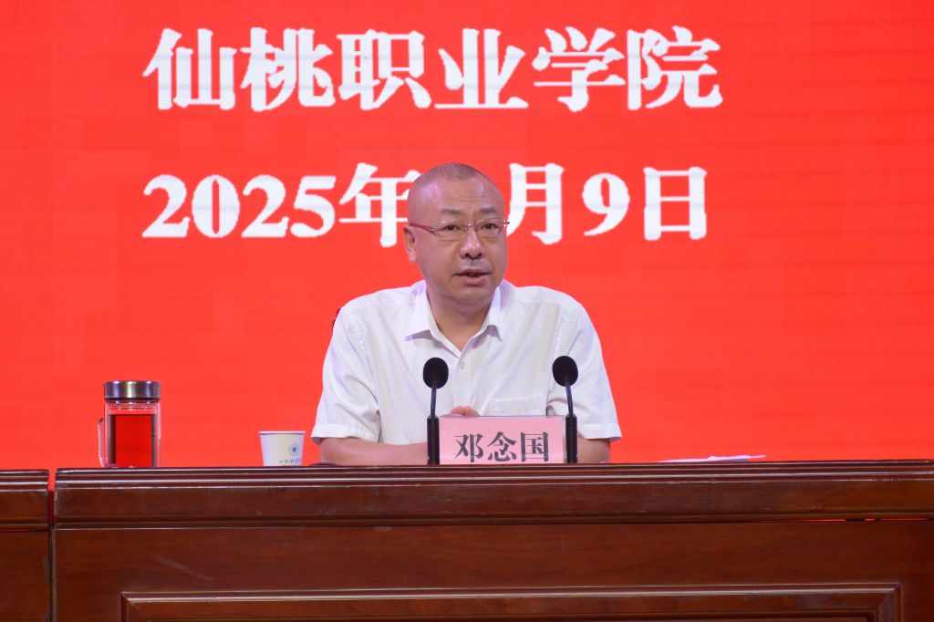 邓念国在讲话中表示,2024至2025学年,学院广大教职工坚持以习近平新时代中国特色社会主义思想为指导,深入贯彻落实党的二十大和二十届二中、三中全会精神,深入贯彻落实习近平总书记考察湖北重要讲话精神,深入贯彻落实全国、全省和全市教育大会精神,锚定职业本科创建和“双高”“双优”建设两大目标,统筹推进育人方式、办学模式、管理体制、保障机制改革创新,着力推动学院发展能级、速度、质效、后劲整体提升,学院党建思政工作更加有力,人才培养成效更加显著,对接区域产业更加紧密,师资队伍建设更加坚实,对外开放合作更加深入,内部治理体系更加完善,各项事业发展取得新突破,服务支点建设取得新成效。在广大教职工身上,我们深切感受到紧跟党走的政治定力、行为世范的高尚品格、诲人不倦的敬业精神、严谨求实的工作作风,“立德正身、笃学尚能”的校训和“乐教善育、精益求精”的教风在仙职人身上得到充分彰显。实践再次证明,仙职教职工队伍是一支政治坚定、业务精湛、作风过硬、值得充分信赖的队伍。