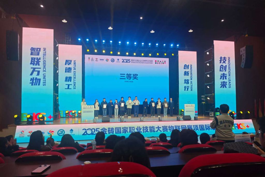 12月13日至14日,2025金砖国家职业技能大赛物联网赛项国际总决赛在邵阳工业职业技术学院举行。比赛中,机械电子工程学院物联网应用技术专业学生程鹏飞、徐凡团结协作、发挥出色,获得该赛项三等奖。