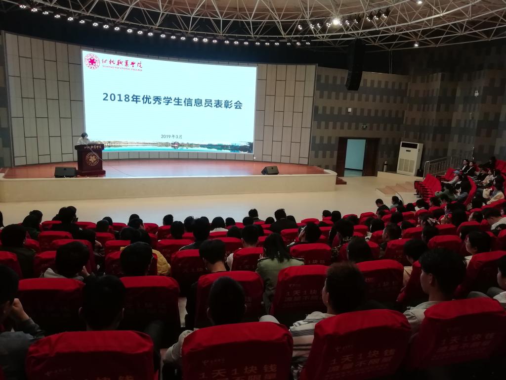 3月26日晚,学院优秀学生信息员表彰大会在多功能厅召开。学工处处长周俊,质量管理办公室主任刘晓菊、副主任邵远梅,经管院副院长陈力洲,计科院副院长廖明辉出席会议。各二级学院诊改工作负责人及学生信息员代表共200余人参加了大会,会议由罗永平老师主持。